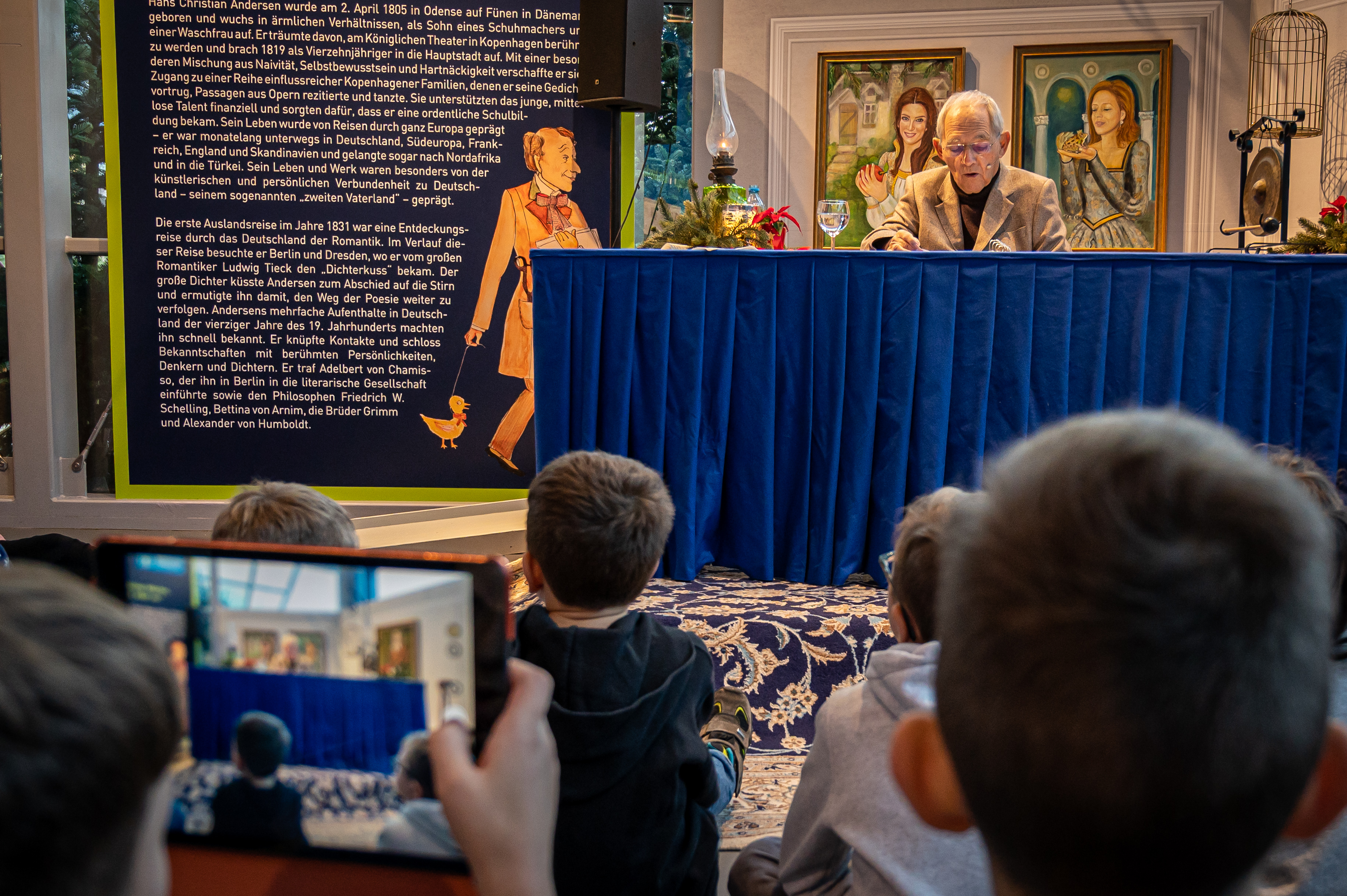 Auch Roland Mack lud in der Adventszeit junge Zuhörer ein, in die fantastische Welt von Hans Christian Andersen einzutauchen. Die Lesung des Europa-Park Inhabers richtete sich speziell an ukrainische Kinder, die der berühmten Geschichte „Des Kaisers neue Kleider“ gebannt lauschten. Die mehr als 20 Kinder besuchen die Vorbereitungsklasse an der Mörburgschule in Schutterwald und konnten ihre neu erlernten Deutschkenntnisse auf unterhaltsame Art und Weise bei der Lesung einsetzen. Im Rahmen eines pädagogischen Digitalprojektes lasen außerdem YouTube-Backexpertin und Unternehmerin Saliha „Sally“ Özcan und Dr. Wolfgang Schäuble MdB für Schüler. Der Bundestagsabgeordnete und gebürtige Freiburger stellte sich nach der Lesung außerdem den interessierten Fragen der Drittklässler der Grundschule Rust. Auch Künstlerin Heide Simm, die Andersens Erzählung „Die Nachtigall“ mit filigranen Scherenschnitten illustriert hat, gestaltete in Zusammenarbeit mit Schülern aus Rust eine interaktive Lesung mit musikalischer Begleitung. Wochenlang hatten sich die Schüler im Unterricht auf das zweisprachige Kulturprojekt vorbereitet, in dem das Märchen sowohl auf Deutsch wie auch auf Ukrainisch gelesen wurde. Noch bis zum Ende der Wintersaison begrüßt die Ausstellung „Andersens Märchenreise im Europa-Park“ die Gäste und präsentiert neben zahlreichen Scherenschnitten des Schriftstellers auch viele weitere Ausstellungsstücke, die Einblick in Andersens Fantasiewelt geben. Die Exponate stellt MÄRCHENLAND – Europäisches Zentrum für Märchenkultur zur Verfügung, dessen erste Vorstandsvorsitzende Miriam Mack ist, die sich seit vielen Jahren für den Erhalt des Märchens als völkerverbindendes Kulturgut einsetzt.