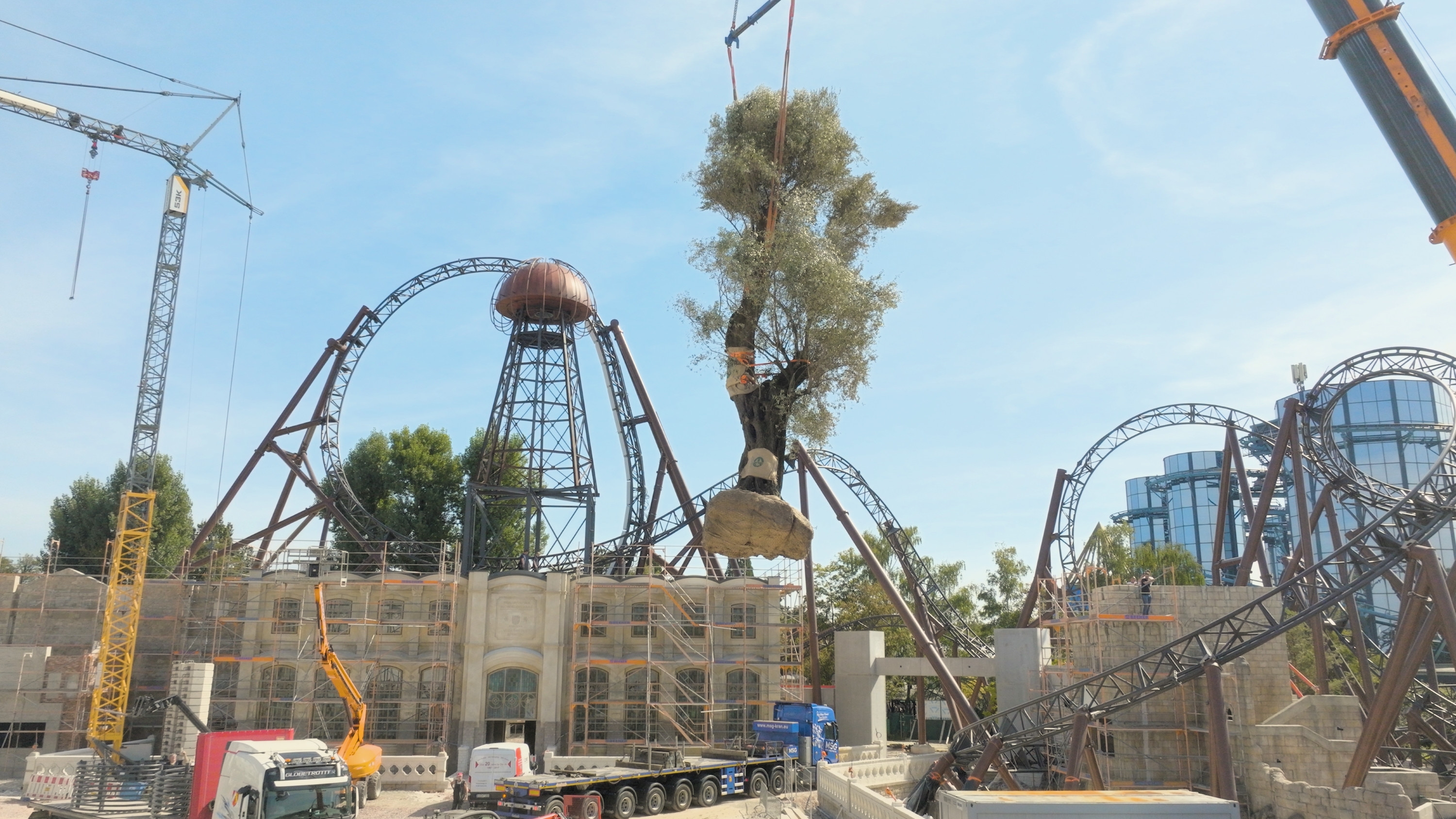 Für mediterranes Flair sorgt dabei seit Kurzem ein eindrucksvoller Olivenbaum. Der 800 Jahre alte, prächtige Baum kam eigens aus der Toskana per Transporter in Deutschlands größten Freizeitpark. Er wiegt rund acht Tonnen und ist stolze elf Meter hoch. Verpflanzt wurde das robuste Gewächs zentimetergenau zwischen den Schienen mit einem Kranwagen. Auch mit zahlreichen weiteren Bäumen und Pflanzen sorgt die Gärtnerei des Europa-Park für stimmiges Flair im zukünftigen Themenbereich.