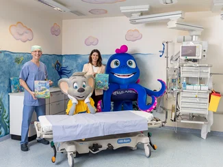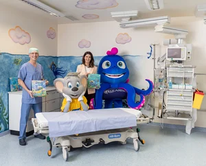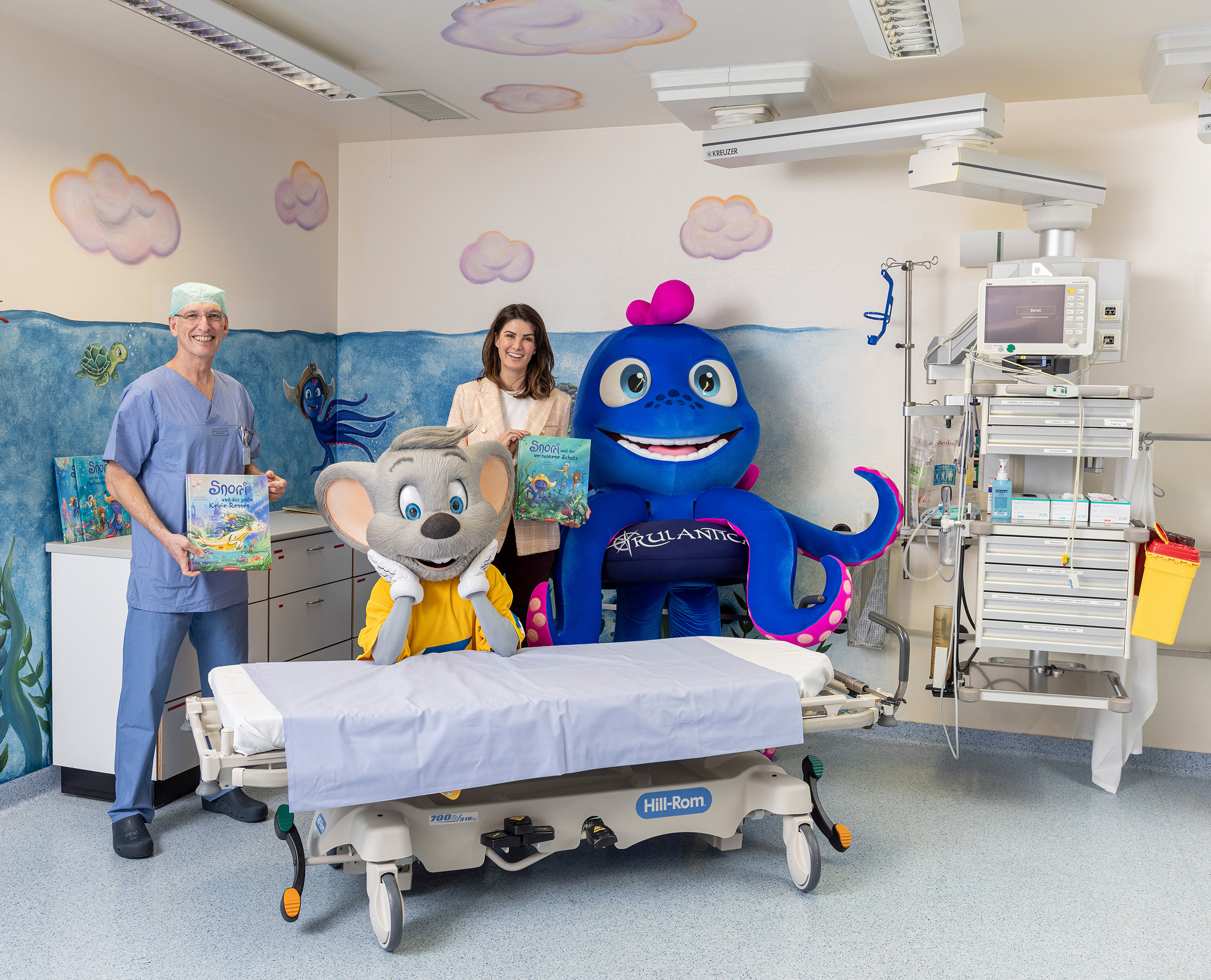 Die Wände der Anästhesie und des Aufwachraums sind nun mit Szenen belebt, die aus einer bunten Korallenlandschaft stammen. Von Snorri, dem Sixtopus, der mit einem Piratenhut verspielt Blasen in das kristallklare Wasser pustet, bis hin zu fröhlich umhertollenden Fischschwärmen – die wunderbaren Illustrationen sind nach ersten positiven Erfahrungsberichten der zu behandelnden Kinder schon nicht mehr wegzudenken. Die fröhlichen Motive wurden von den beiden Künstlerinnen Anna Hüllner und Marion Touchemoulin gestaltet.