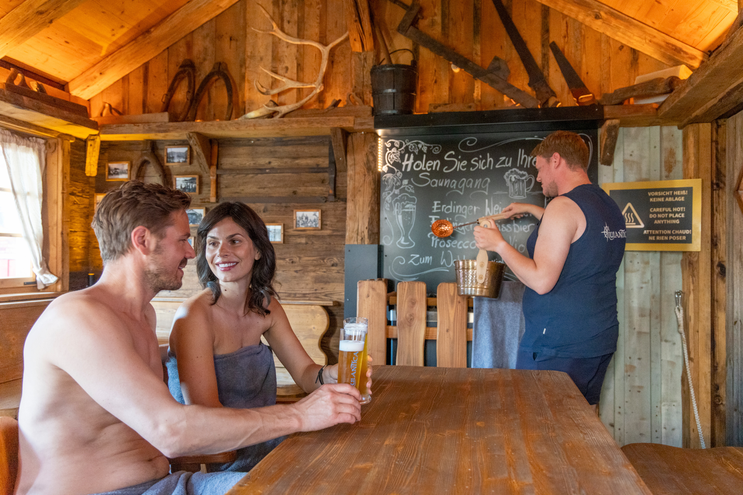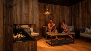 KOTA Sauna Chalet (16m²): Im urigen KOTA Sauna Chalet auf der Außenterrasse von Hyggedal schwitzt es sich bei einem eisgekühlten Weißbier besonders zünftig! Ausgestattet mit Saunaofen, rustikalen Tischen und Sitzgelegenheiten, lädt die gemütliche Stube zum textilfreien Saunieren in geselliger Runde ein.