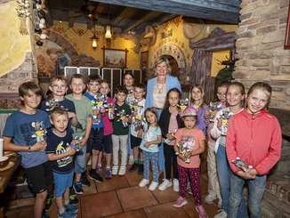 Das Geld, das gemeinsam mit vielen Wünschen in einem Rahmen verpackt war, geht an einen an Rheuma erkrankten Jungen aus der Region, der vom Vererein „Einfach Helfen e.V.“ seit vielen Jahren betreut wird. Zudem übergab jedes Kind eine selbst gebastelte Joy, das neue Maskottchen der Kirche im Europa-Park, auf der es Wünsche niedergeschrieben hatte, an Mauritia Mack.