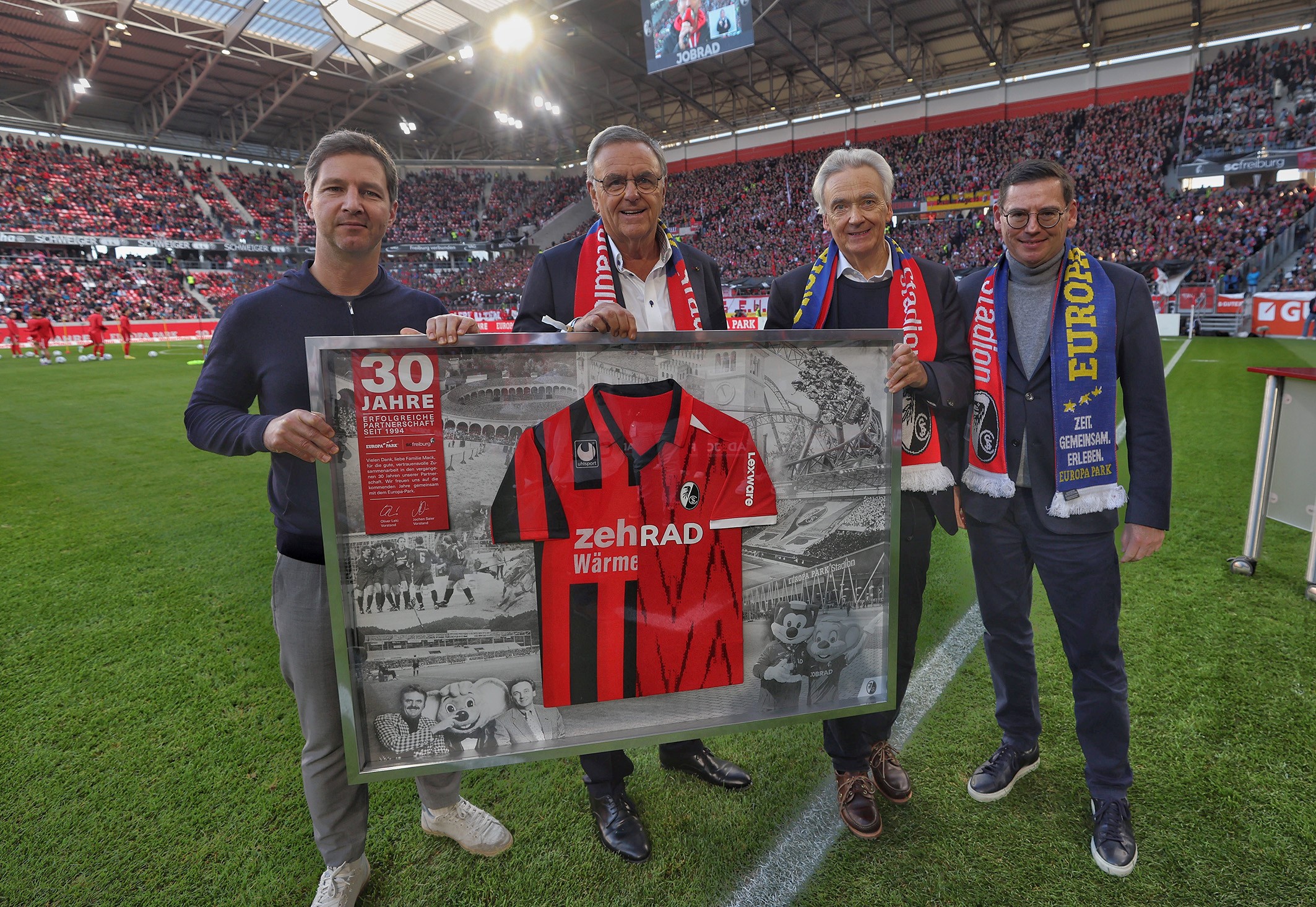 Mit einem aufwändig gestalteten Unikat würdigte der SC Freiburg die 30-jährige Partnerschaft mit dem Europa-Park. Oliver Leki, Vorstand SC Freiburg, überreichte Roland und Jürgen Mack eine Collage mit einem Trikot, das zur Hälfte aus der Saison 1994/95 stammt und zur anderen Hälfte aus der aktuellen Saison, umrahmt von Fotos der vergangenen Jahre. „30 Jahre sind eine lange Zeit und im Profifußball keine Selbstverständlichkeit“, machte SC-Vorstand Oliver Leki deutlich und bedankte sich gemeinsam mit seinem Vorstandskollegen Jochen Saier „beim Europa-Park und vor allem bei der Familie Mack für die vertrauensvolle Zusammenarbeit und die Unterstützung in den vergangenen drei Jahrzehnten“.