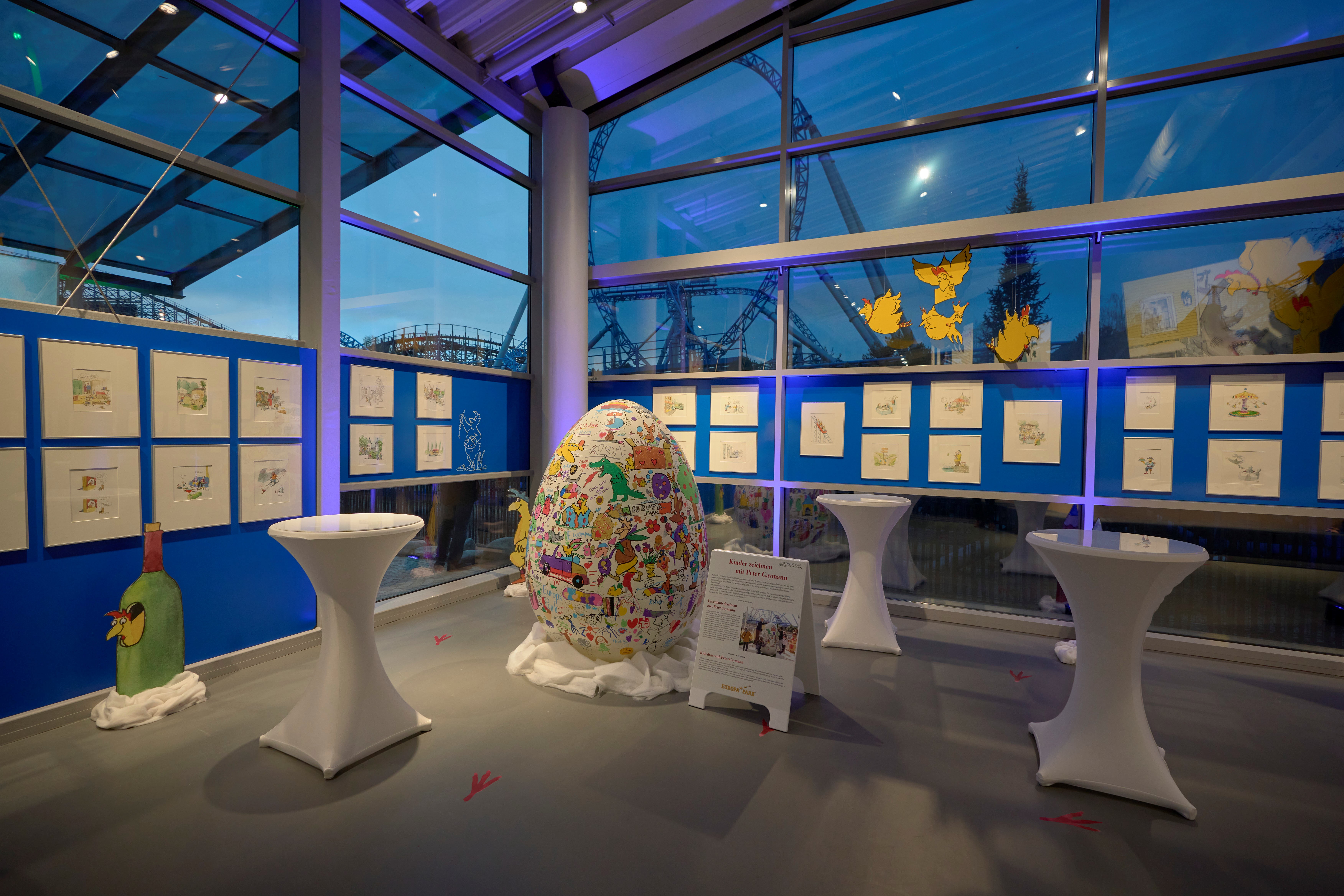 Unter dem Titel „Da lachen ja die Hühner – Peter Gaymanns Zeichnungen im Europa-Park“ werden mehr als 80 Originale und signierte Drucke des populären Künstlers gezeigt. Außerdem ein bemalter Fiat 500, ein überdimensionales bemaltes Ei und Vieles mehr. Bis zum 28. April 2024 ist die Ausstellung im blue fire Dome im Isländischen Themenbereich des Europa-Park zu sehen.