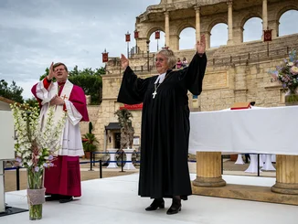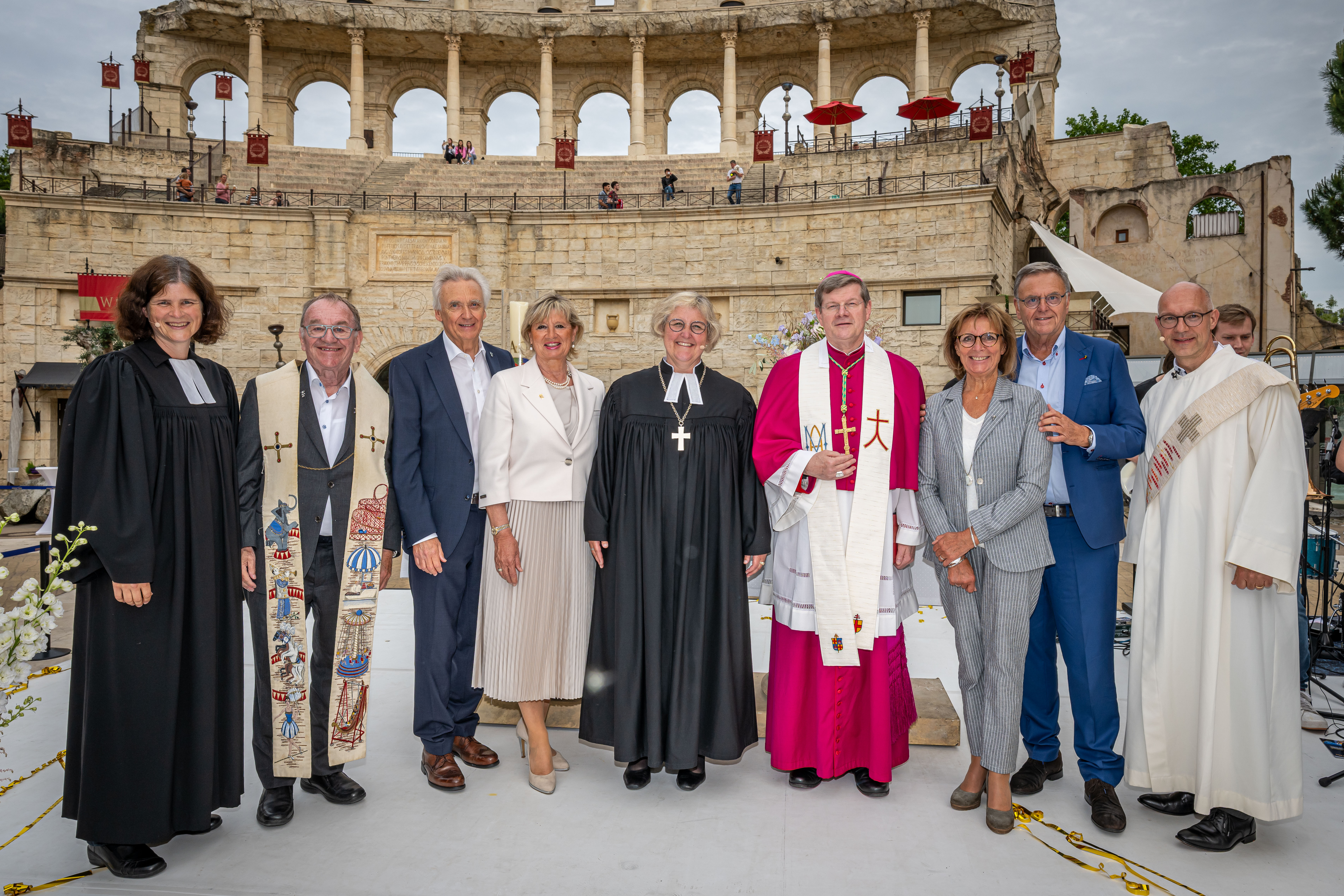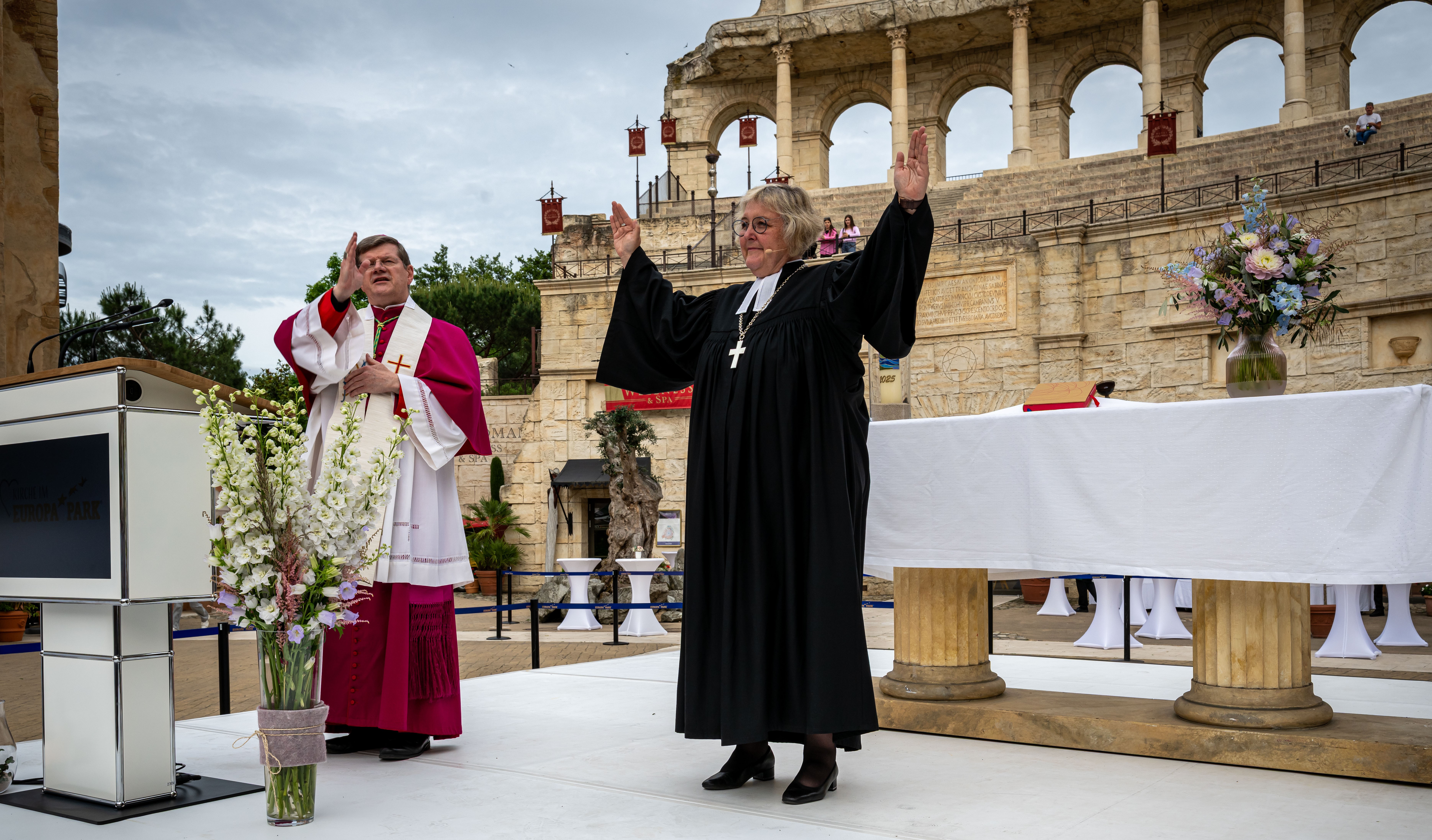 Knapp 500 Menschen versammelten sich am 5. Juni auf der Piazza des Hotels „Colosseo“, um gemeinsam den Open-Air Jubiläumsgottesdienst zum 50. Jubiläum des Europa-Park zu feiern. Mit persönlichen Worten eröffnete Roland Mack, Inhaber des Europa-Park, die Feierlichkeiten: „Die ‚Kirche im Europa-Park‘ ist für mich ein Vorzeigeprojekt gelebter Ökumene und ein starkes Zeichen für eine mutige, menschennahe Kirche. Genau das haben wir beim Jubiläumsgottesdienst im Europa-Park erlebt. Es braucht heute eine Kirche, die auch zu den Menschen kommt.“