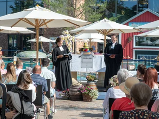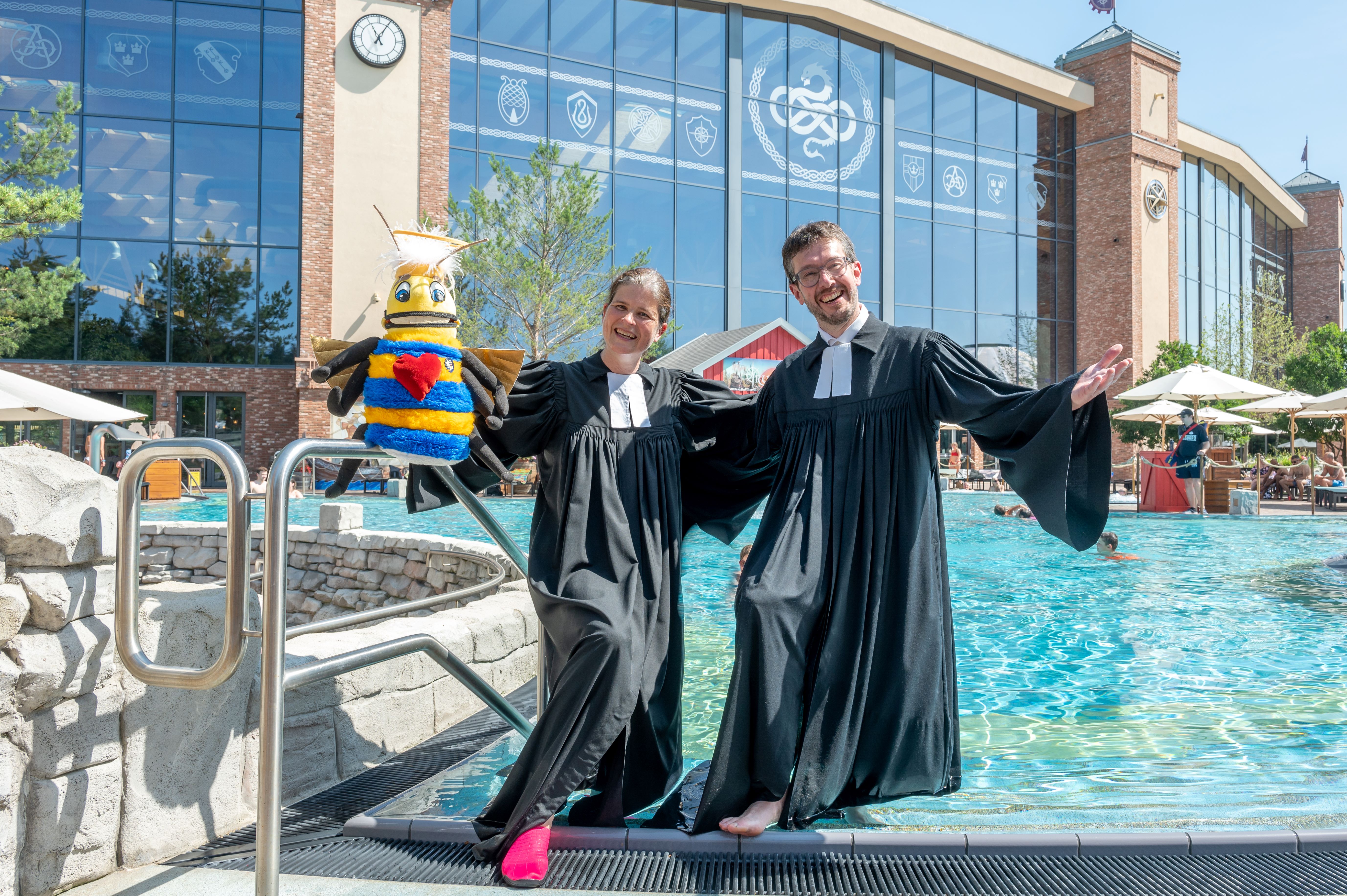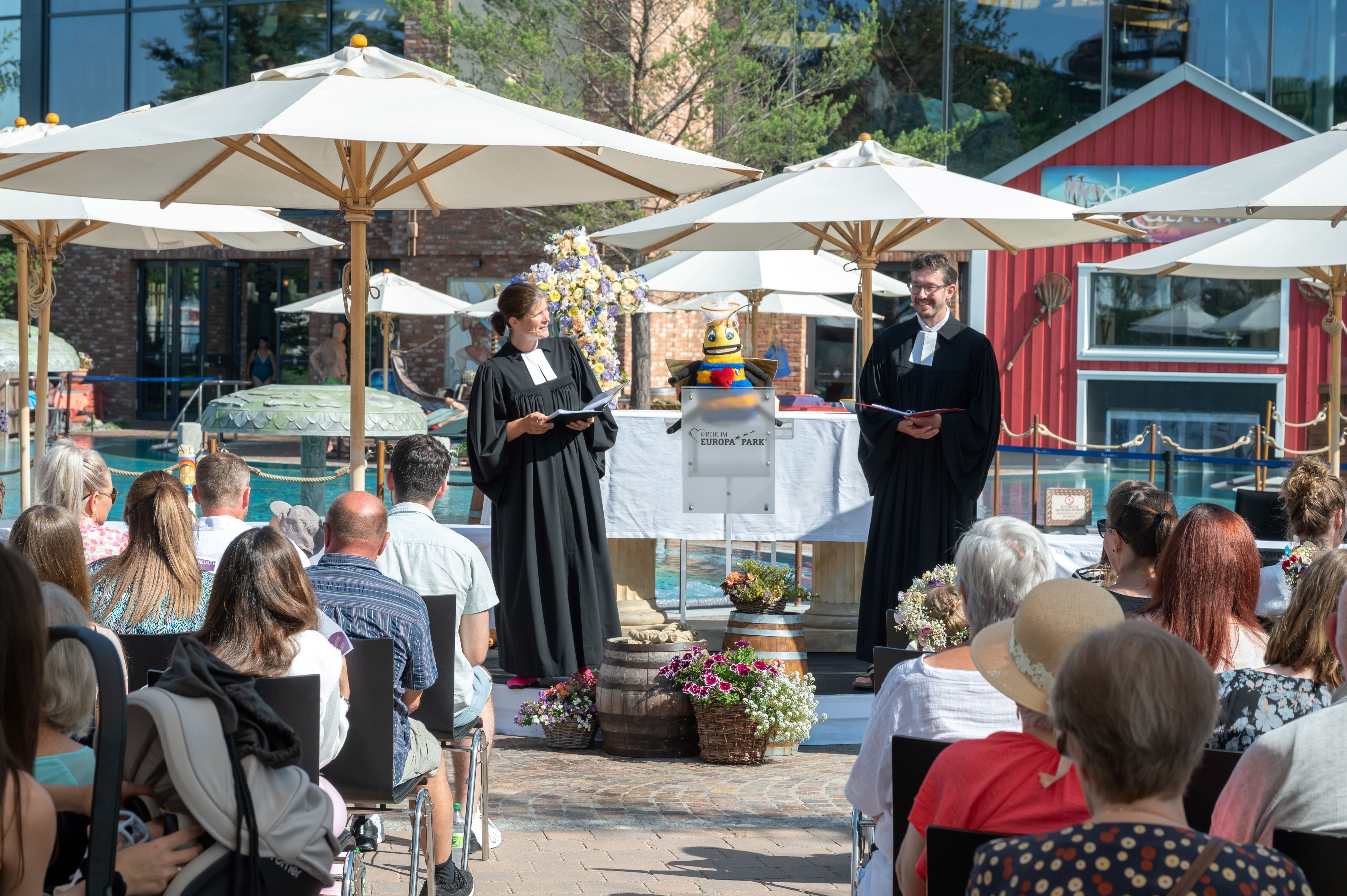 Zum ersten Mal wurden am Sonntag neun Kinder aus der Region in der Wasserwelt Rulantica im Rahmen eines ganz besonderen Gottesdienstes getauft. Die Feier, gestaltet von der Seelsorgerin der „Kirche im Europa-Park“ Andrea Ziegler, Pfarrer Jörg Herbert und Diakonin Medea Frey, fand am Rande des Außenpools „Frigg Tempel“ statt und wurde vom Posaunenchor Kippenheim unter der Leitung von Andreas Beinroth musikalisch umrahmt.