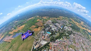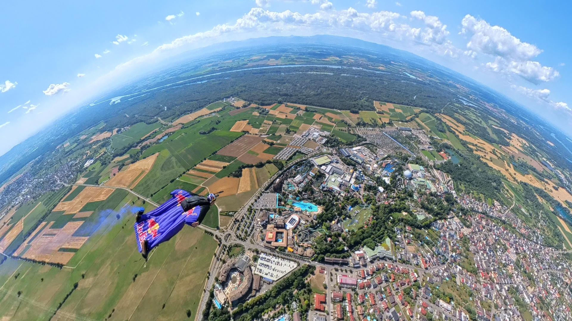 Pfeilschnell! Spektakulärer Wingsuit-Sprung aus dem Europa-Park Zeppelin zum Jubiläum
