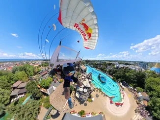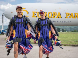 Ein unvergesslicher Moment für alle Gäste und ein technisches Meisterwerk der Luftakrobatik: Zum 50. Geburtstag des Europa-Park wagten die österreichischen Extremsportler Marco Fürst und Marco Waltenspiel einen einzigartigen Wingsuit-Sprung aus dem neuen Europa-Park Zeppelin. Mit atemberaubender Präzision und einer Geschwindigkeit von rund 260 km/h stürzten sich die Profis aus einer Höhe von circa 1.000m AGL (über Grund) in die Tiefe und landeten im portugiesischen Themenbereich – direkt vor der Wasserachterbahn „Atlantica – SuperSplash“. Die beiden Athleten Marco Fürst und Marco Waltenspiel waren die ersten Menschen, die durch die Tower Bridge in London geflogen sind und jetzt sind sie auch die ersten Wingsuit-Athleten, die mitten im Europa-Park gelandet sind.