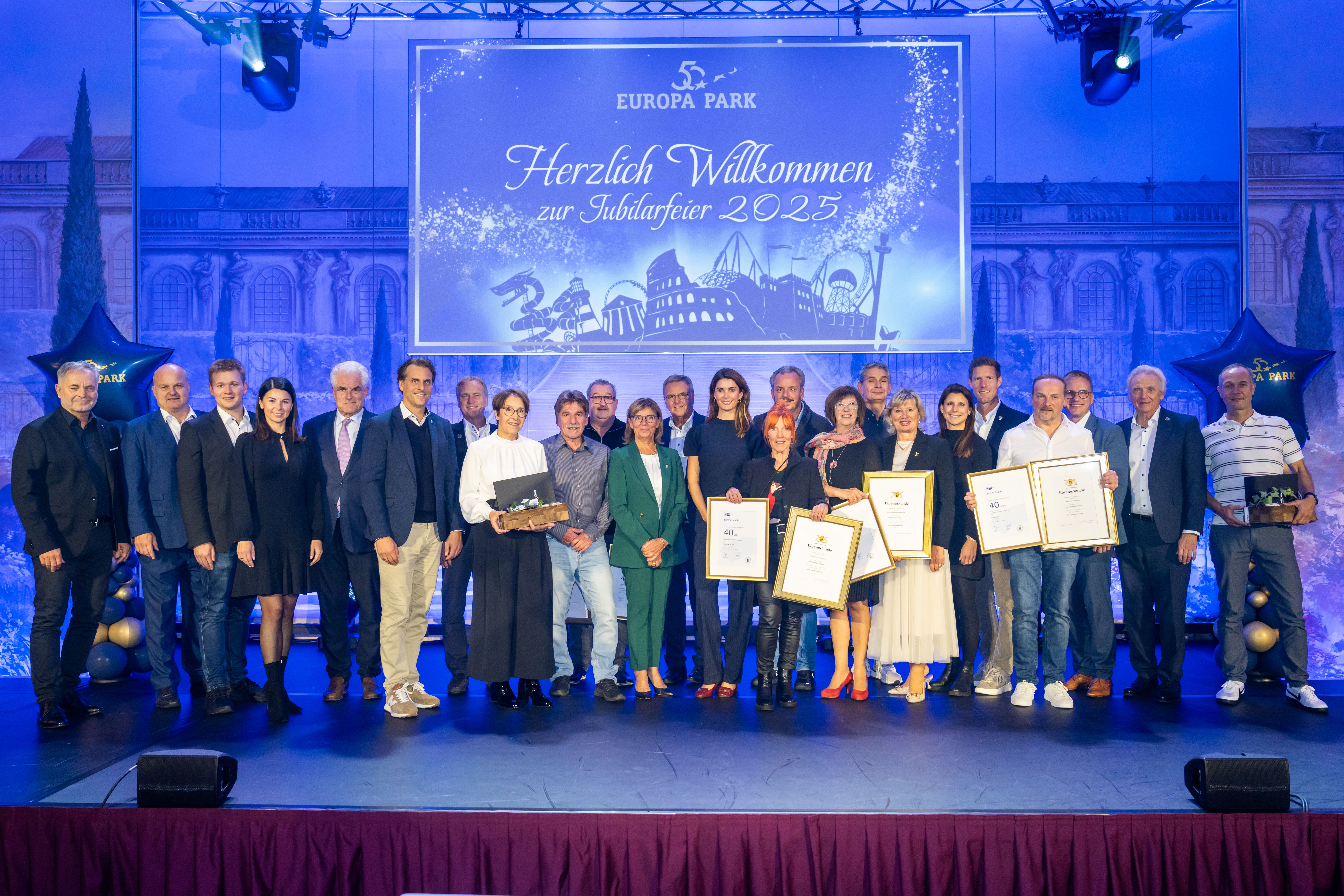 Anschließend überreichten die Europa-Park Inhaber Roland und Jürgen Mack sowie Frederik Mack, Direktor HR & Organisation, gemeinsam die Auszeichnungen an die Jubilare. Von Seiten der IHK nahm Vizepräsident Andreas Truttenbach an der Feier teil. Dr. Kai-Achim Klare, Bürgermeister der Gemeinde Rust, überreichte an die Jubilare mit 40 Jahren Betriebszugehörigkeit, stellvertretend für Ministerpräsident Winfried Kretschmann, die Ehrenurkunde des Landes Baden-Württemberg. Die weiteren geehrten Mitarbeitenden sowie die Ruheständler erhielten liebevoll zusammengestellte Geschenkkörbe vom Europa-Park. Roland Mack ehrte den langjährigen Geschäftsleiter Engelbert Gabriel sowie den Geschäftsführer von MACK Rides Christian von Elverfeldt für ihre Loyalität, ihre Weitsicht und ihre wertvolle Arbeit, die sie seit Jahrzehnten in den Europa-Park und MACK Rides einbringen. Beide haben das Unternehmen in ihren Bereichen maßgeblich geprägt. Jürgen Mack ehrte zusätzlich Klaus Hauer, der seit 25 Jahren im Unternehmen tätig ist und den kompletten Finanz- und Controlling-Bereich verantwortet, für seinen herausragenden Einsatz. Ein stilvolles Showprogramm und ein 3-Gänge-Menü sorgten für einen feierlichen Rahmen und rundeten den Abend ab.