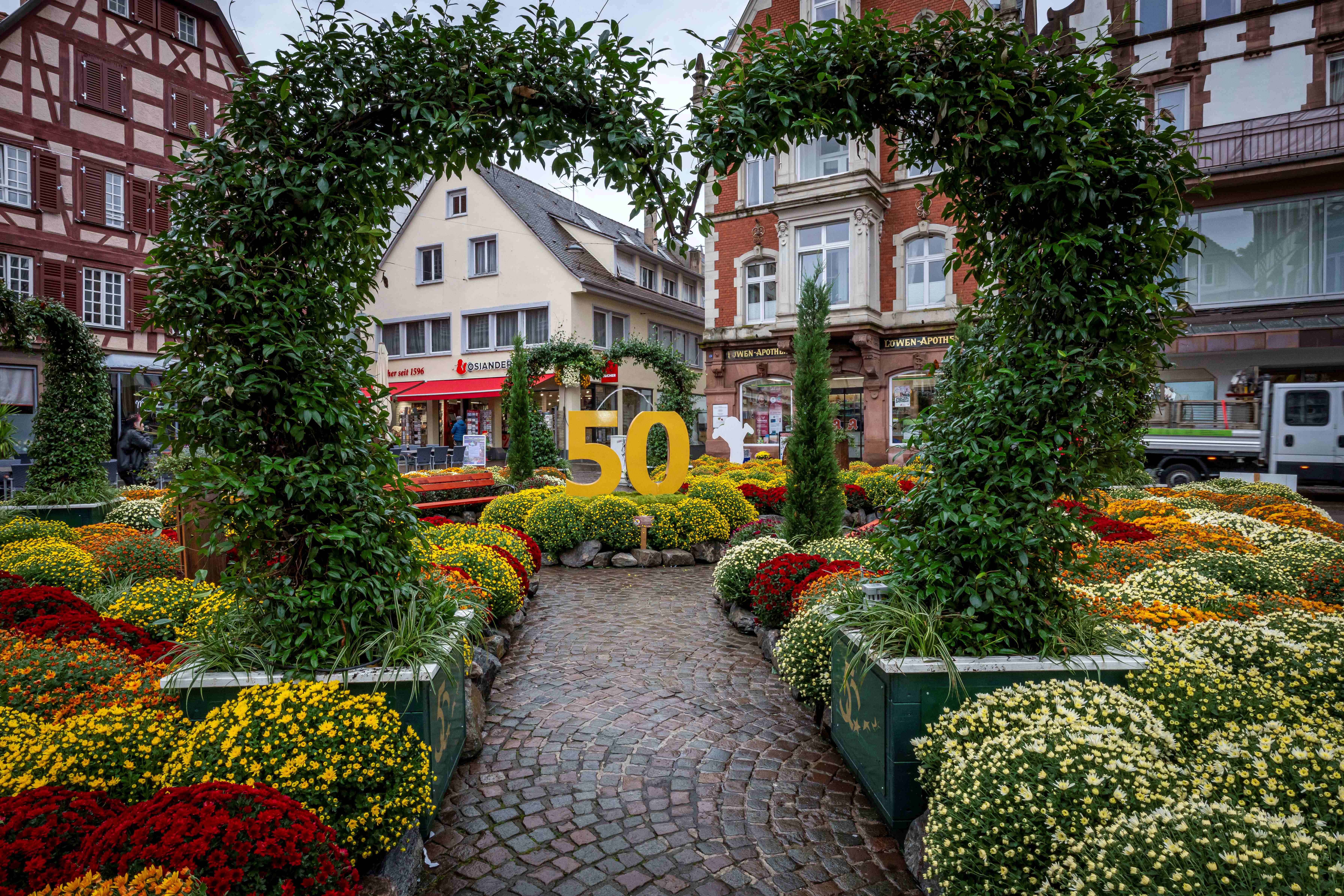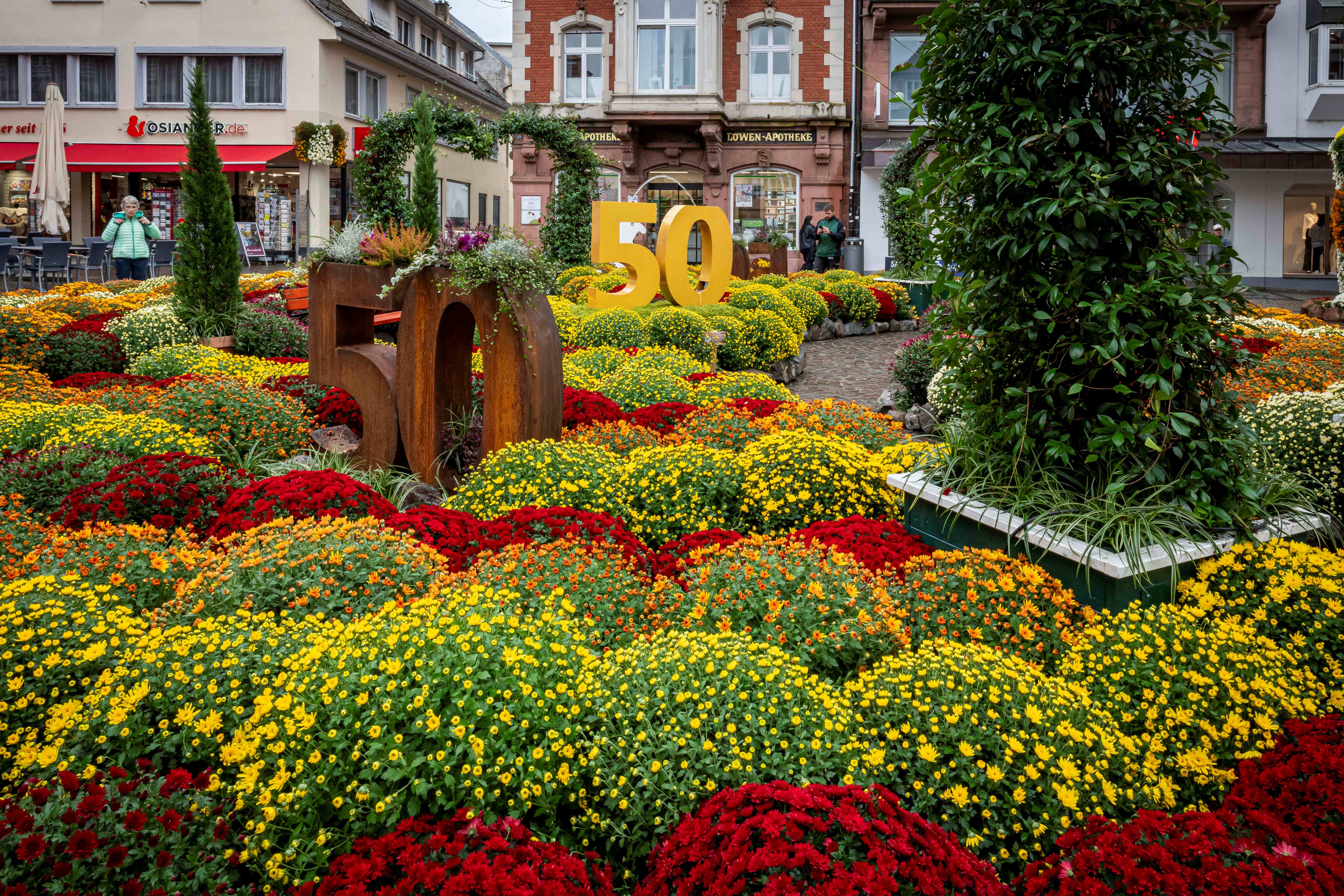 In einer logistischen Meisterleistung und rund drei Stunden Arbeit verwandelten 20 Gärtner den Lahrer Sonnenplatz in ein schillerndes Kunstwerk zum Thema „sagenhafte 50 Jahre“. In der Mitte des Beetes wurde eine „Goldene 50“ als Wasserspiel installiert. Die darum gruppierten Bänke laden die Besucher ein, das Flächenbeet auch zu begehen, selbst zu erkunden und zu verweilen. Umrundet werden die Bänke von Herzbögen aus echtem Jasmin. Das Herz zeigt die gelebte Verbundenheit zu allen, die am Erfolg des Europa-Park beteiligt sind und die Detailverliebtheit für die Deutschlands größter Freizeitpark bekannt ist. Über 400 Chrysanthemenbüsche in fünf verschiedenen Farben schenken dem Beet lebendige, bunte Akzente. Der Europa-Park legt großen Wert darauf, regionale Produzenten und Lieferanten in ihre dekorative Gestaltung und Arbeit mit einzubeziehen.