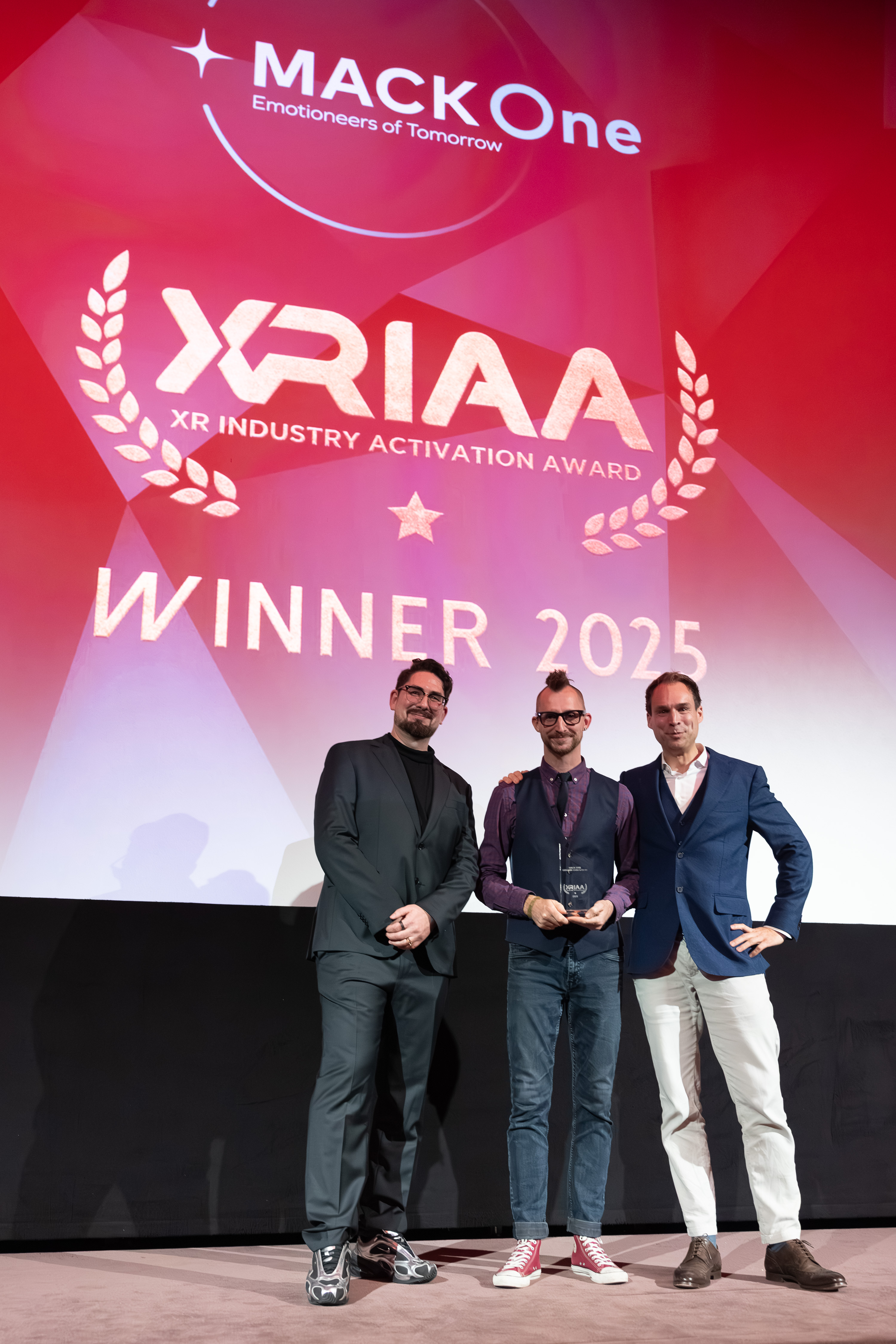 Im November wurde MACK One mit dem „XR Industry Activation Award 2025“ für den „FLOWRYDE“ von nextReality.Hamburg e.V. ausgezeichnet. Die Auszeichnung würdigt Unternehmen, die XR in die Realität holen. Mit Engagement, Innovationskraft und Überzeugung zeigen sie, wie immersive Technologien wirtschaftliche, kreative und gesellschaftliche Entwicklungen vorantreiben. Gemeinsam mit namhaften Unternehmen wie Meta, CUPRA, Porsche AG, Lufthansa Group, Henkel und der ERGO Group AG nahm das Projektteam von MACK One die Ehrung in Hamburg entgegen.