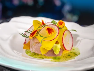 Silvio Germann, Küchenchef des Zwei-Sterne Restaurants Mammertsberg in Freidorf in der Schweiz, steht für eine elegante Balance aus hochwertigen, saisonalen Zutaten, klaren Aromen und viel Liebe zum Detail. 2024 wurde er vom Gault&Millau zum Koch des Jahres gekürt. Mit dem Anspruch, dass "man sieht, was man isst", gestaltet Silvio Germann seinen Gang für den Raum Ocean. Dort setzt er mit Hamachi, Gelber Bete und Kamille einen präzisen Akzent innerhalb der multisensorischen Reise.