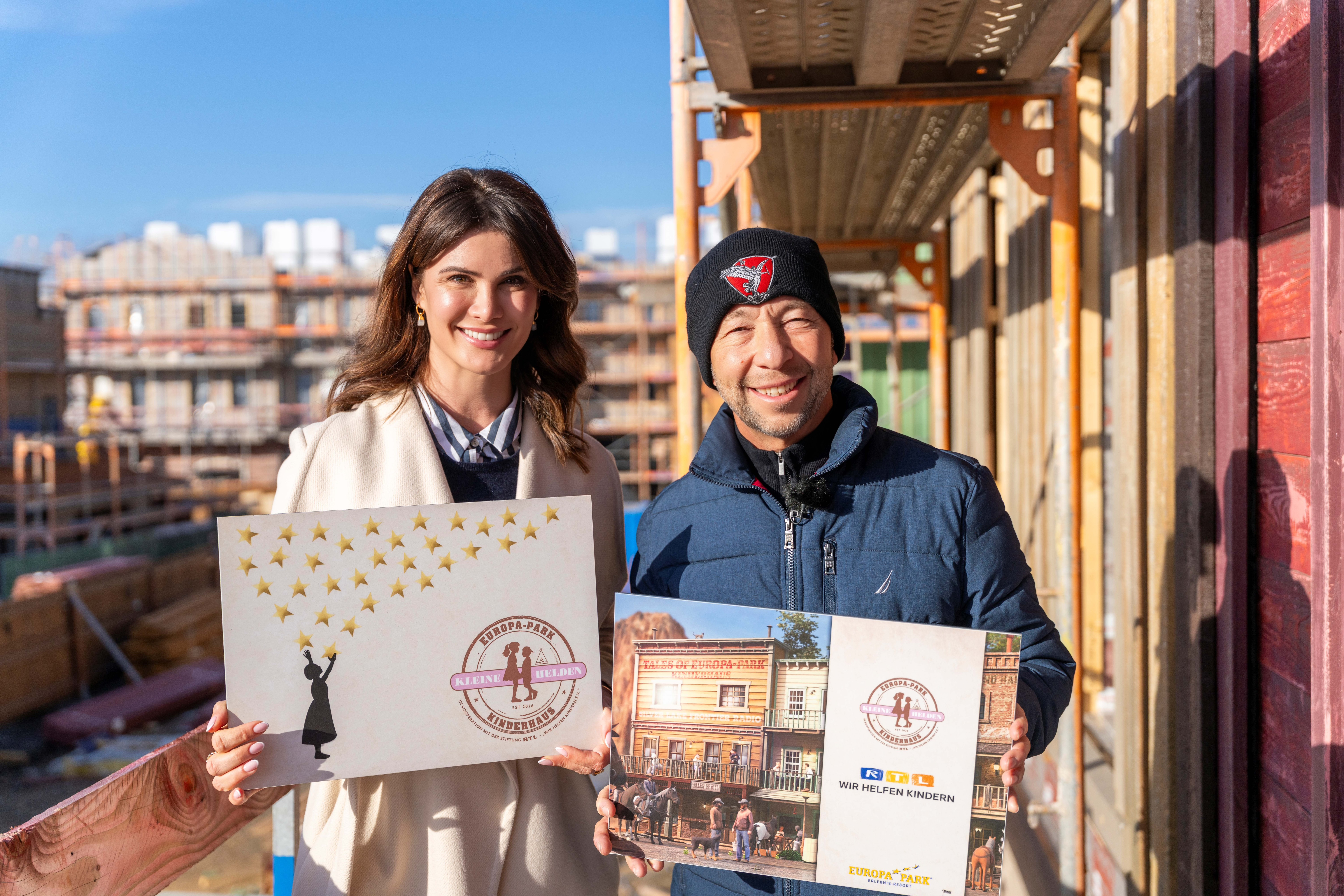 Bei einer gemeinsamen Baustellenbesichtigung informierten sich Projektpate DJ Bobo und Botschafterin Miriam Mack über den aktuellen Baufortschritt. Mit fünf Apartments entsteht in der Silver Lake City des Europa-Park Erlebnis-Resort ein Rückzugsort für Familien mit Kindern, die eine Krebserkrankung überstanden haben.
