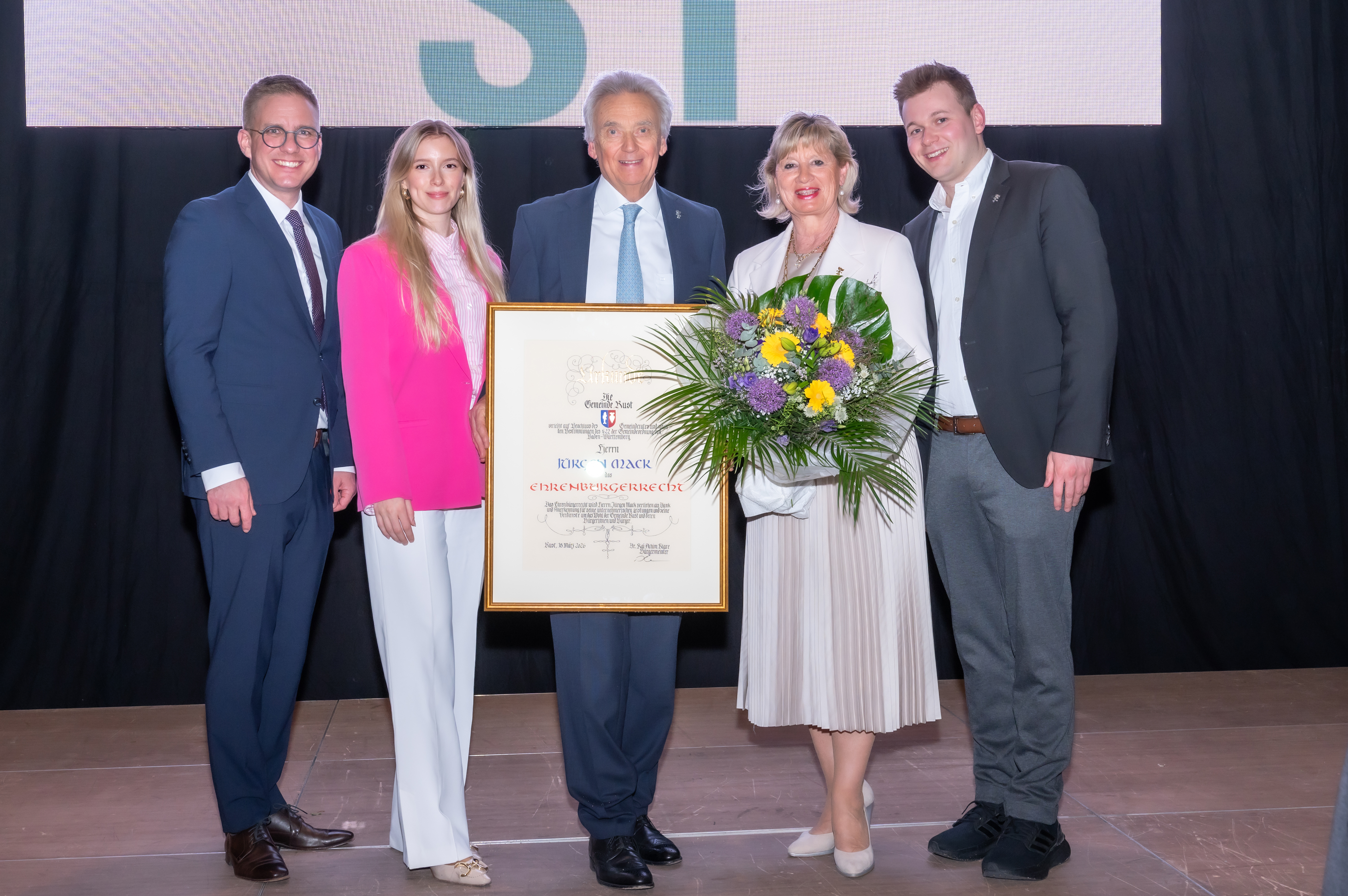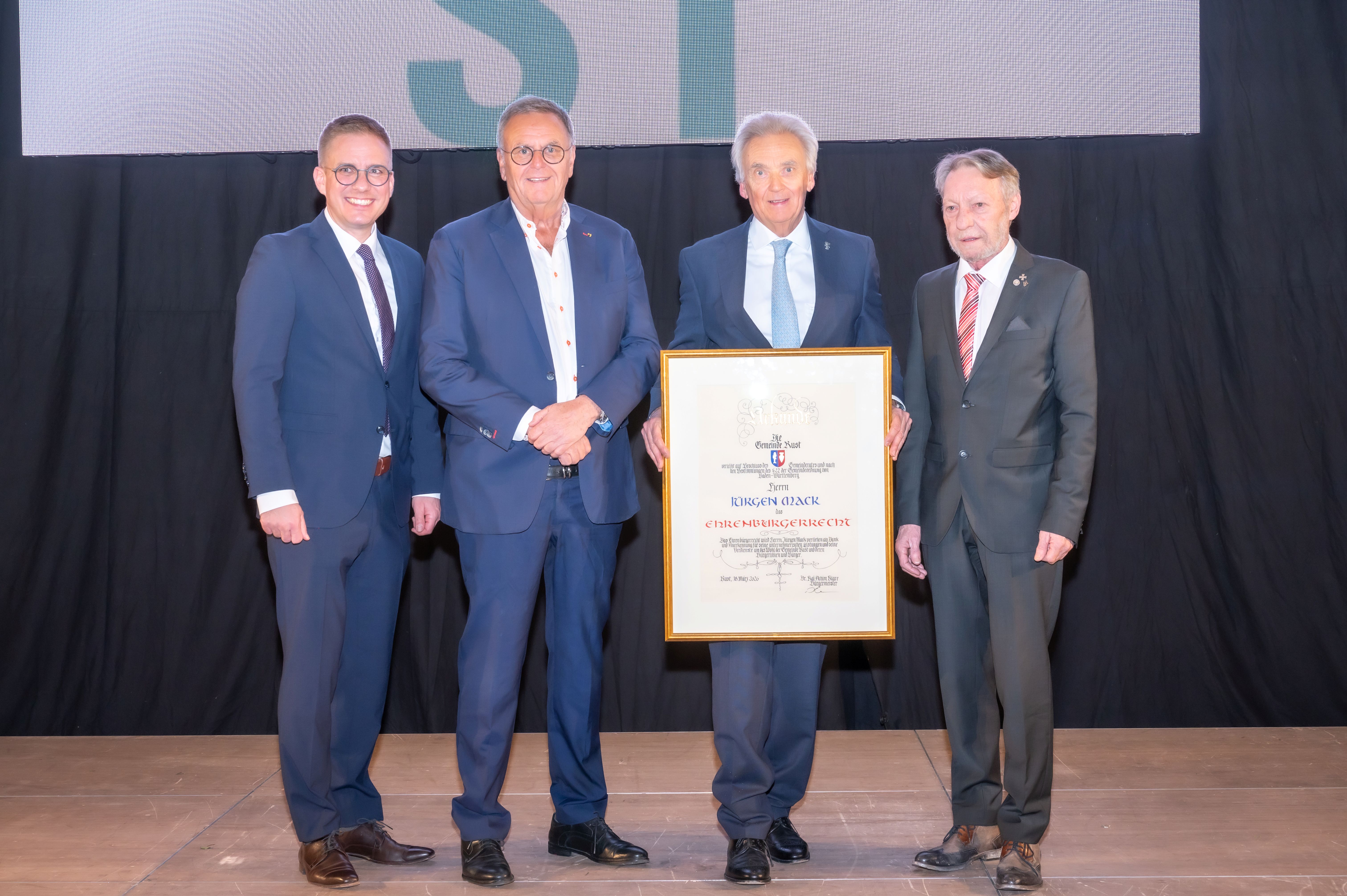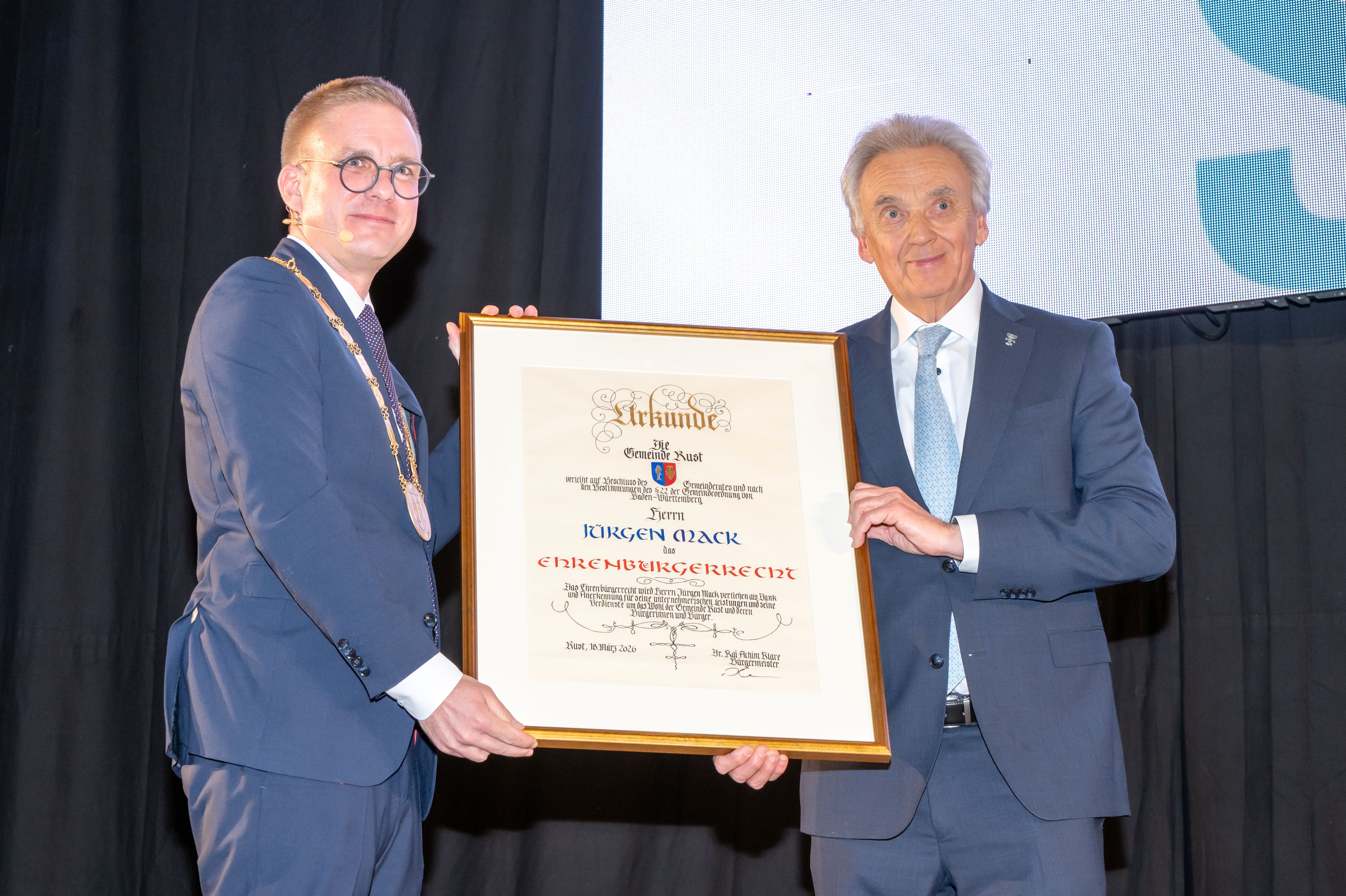 Europa-Park Inhaber Jürgen Mack wurde von der Gemeinde Rust zum Ehrenbürger ernannt. Bürgermeister Dr. Kai-Achim Klare betonte in seiner Laudatio insbesondere das langjährige unternehmerische Engagement von Jürgen Mack, durch das sich Rust zu einer international bedeutenden Tourismusdestination entwickelt hat. Der Gemeinderat hatte die Verleihung der Ehrenbürgerwürde zuvor einstimmig beschlossen.