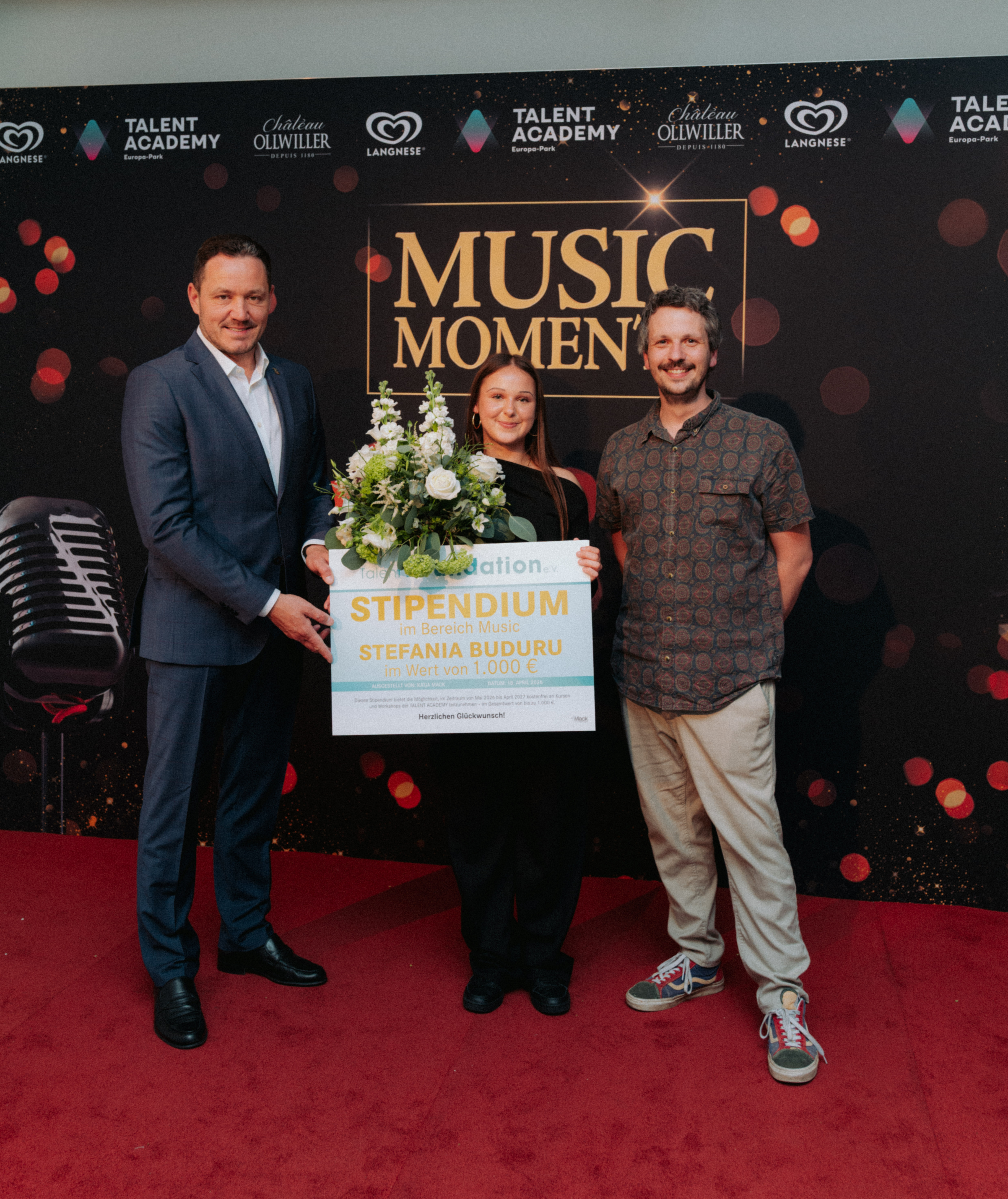 In diesem Jahr wird zudem erstmals ein Musik-Stipendium im Wert von 1000 Euro an ein Mitglied der TALENT ACADEMY vergeben. Das Stipendium ging an die 15-jähirgen Stefania Buduru, die seit 2018 am Vocal Coaching mit Dominik Büchele teilnimmt. Das Stipendium wurde von Matthias Kirch, stellvertretender Vorstandsvorsitzender der Talent Foundation e.V., überreicht. Der Förderverein vergibt jährlich jeweils ein Stipendium in den Bereichen Dance, Acrobatics, Music und Art an Mitglieder der TALENT ACADEMY.