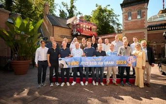 Sportlicher Besuch im Europa-Park Erlebnis-Resort: Die deutsche Fußball-Nationalmannschaft von 1996, die sich damals im Londoner Wembley-Stadion mit dem Europameistertitel krönte, traf sich kurz vor Beginn der EM 2024 in Deutschlands größtem Freizeitpark.